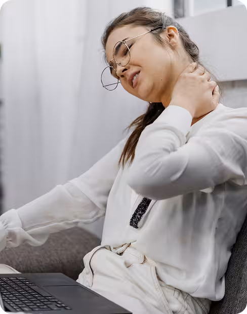 Junge Frau mit Brille und Laptop fasst sich schmerzverzerrt an den Nacken und Schulter.